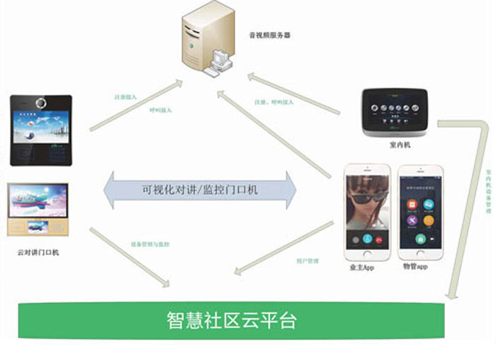 采用“云對講門口機+云平臺+音視頻平臺+室內機+業(yè)主app+物管app”的系統(tǒng)架構