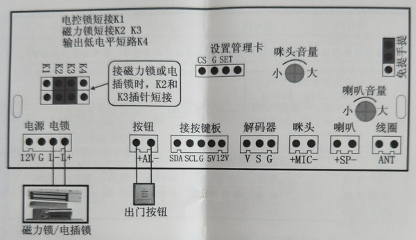 1、設(shè)置管理卡: 設(shè)備在斷電的狀態(tài)下短接主板上的"G”和“管理卡”插針,然后上電(上電后可去除短接,也可保留)進(jìn)入設(shè)置管理卡和刪除卡模式。接著刷待注冊(cè)的[管理卡]。再刷待注冊(cè)的I刪除卡]。兩張卡片刷完后斷電去除短接再上電,完成設(shè)置工作。