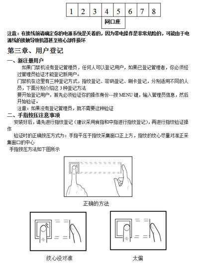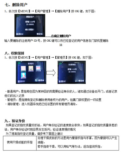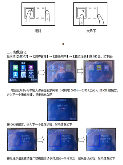 最終指紋還是無法識別的用戶,可將該指紋刷次再重新注冊,或注冊另一枚手指,這樣的用戶在注冊時需要選擇使用質量較好的指紋(指紋清晰等),盡量使用手指接觸指紋采集頭面積大一些,注冊完成后做一下對比測試,并建議多注冊幾枚備用指紋。